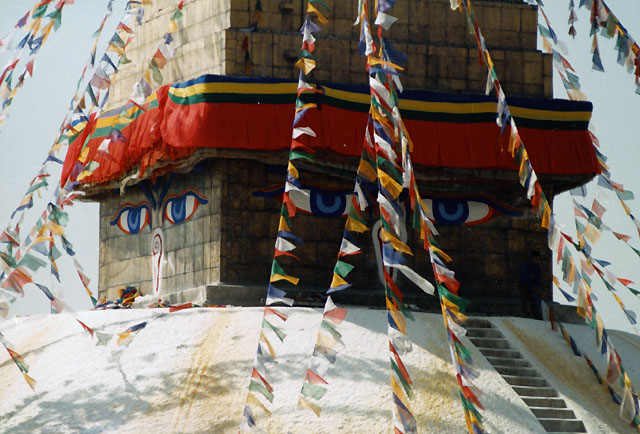 Ступа Боднатх – это одна из самых больших буддийских ступ в мире, диаметр ее основания – примерно семьдесят метров. Ступа представляет собой пространственную мандалу, основание символизирует землю, полусферический свод – воду, шпиль из 13 ступенек – огонь, зонтик – воздух, а венчающий все бельведер – пространство.