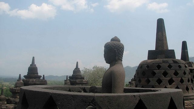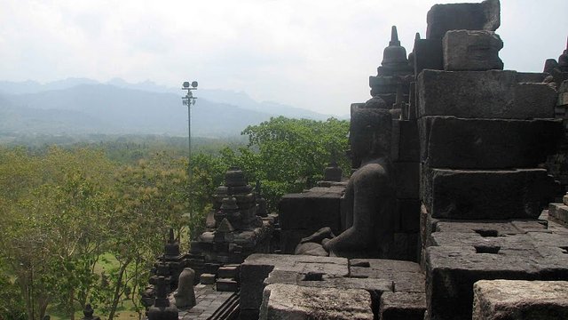 В самом нижнем находится мир человеческих желаний, подпадающий под влияние отрицательных импульсов. В среднем уровне человек достигает контроля над этими импульсами и использует их только в позитивном плане. А на высшем уровне человеческий мир совсем освобождается от всех видов выражаемых словами желаний, в том числе желаний физических, которые обременяли его с самого начала существования. Большая ступа в середине воплощает идею пустоты – состояния, где отсутствует как существование, так и несуществование. Таким образом, Боробудур представляет собой каменный символ десяти ступеней, которые должен пройти Боддхисаттва, прежде чем он достигнет состояния Будды.
