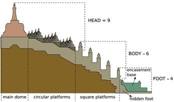 Боробудур – это ступа, имеющая восемь уровней, шесть нижних – квадратные, а три верхних – круглые. Возведенный в стиле, сочетающем традиции индуизма и буддизма, чанди Боробудур наглядно представляет три аспекта или уровня мироздания в соответствии с буддийскими представлениями Абхидхармы.