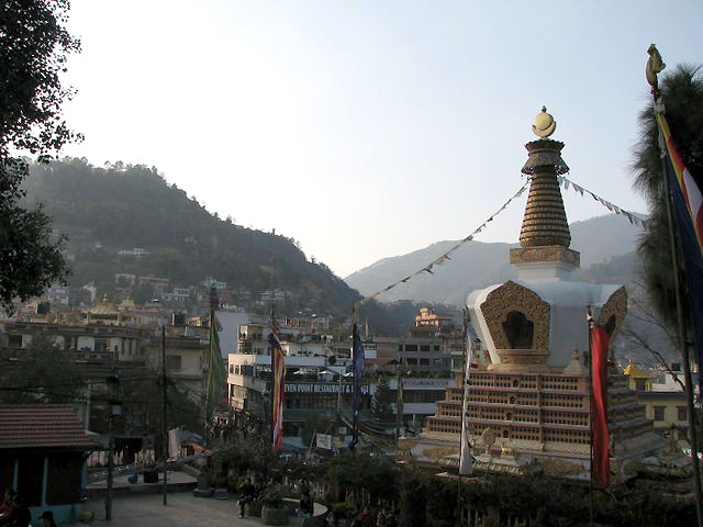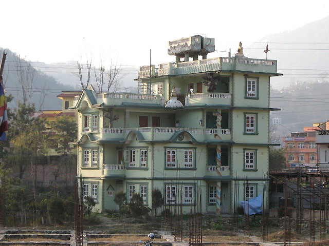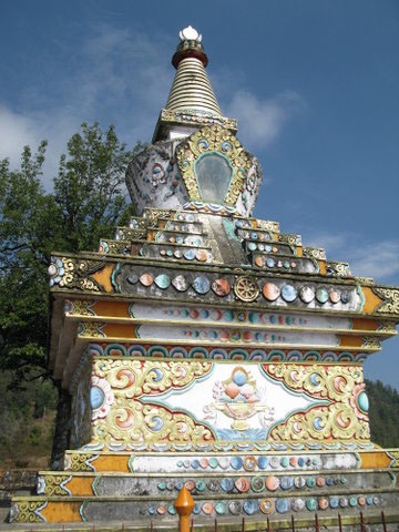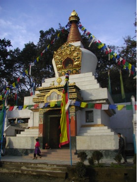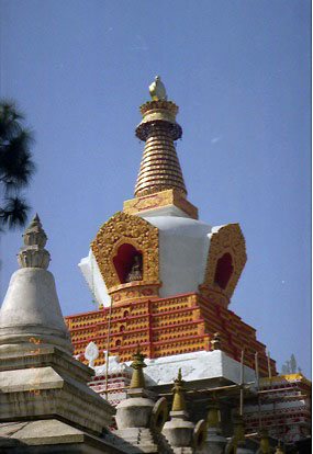 Иногда ступы строятся над «козырьками» перед входом в здание, в данном случае на входе в гостиницу, в результате все входящие получают ее благословение.