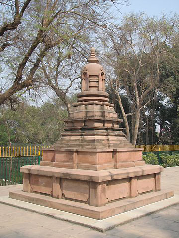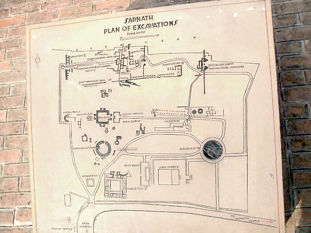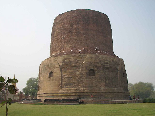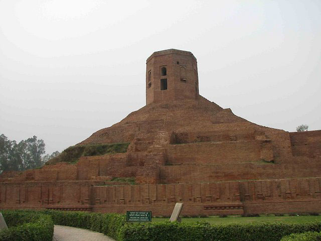 Единственный почти неповрежденный исторический памятник Сарнатха – Ступа Дхамекх (от санскр. «дхарма», пали «дхамма») высотой 38,4 метра, диаметром 27,9 метра, уходящая на 3 метра под землю. В течение многих лет основание ступы было покрыто травой и окружено галькой, глубиной 5,4 м. Когда эта галька была убрана археологами, открылось восьмиугольное основание ступы, облицованное резным камнем. Это одна из самых первых буддийских ступ, датируемая 249 г. до н. э. Ее построил император Ашока в ознаменование Первого поворота колеса Учения. От этой постройки в настоящее время остались лишь немногочисленные барельефы. Хотя многое из каменной облицовки исчезло, некоторые подлинные образцы сохранились. Существующее массивное сооружение возведено в начале VI в н.э. Ниши в каждой из восьми полукруглых граней некогда украшали скульптуры, частично сохранившиеся до наших дней и хранящиеся в музее.