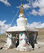 Ступы в ТибетеКроме классических восьми ступ в Тибете, Бутане и некоторых других местах получили распространение также «упрощенные» ступы, в архитектуре которых не видно четких пропорций и всех элементов восьми традиционных ступ. Эти ступы больше походят на небольшие домики без двери, на крыше которых расположен еще один «домик» с Будда-аспектом. Иногда сверху добавляется традиционный шпиль с тринадцатью кольцами. |