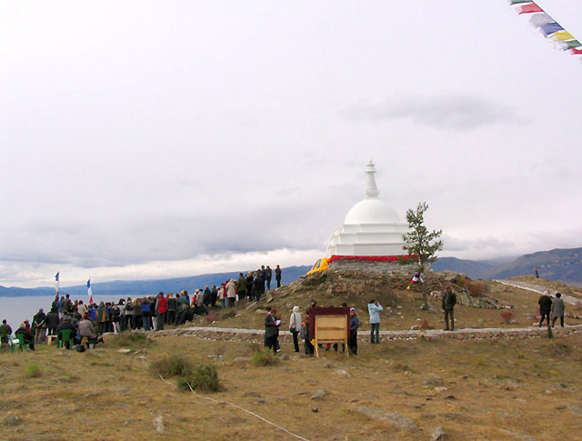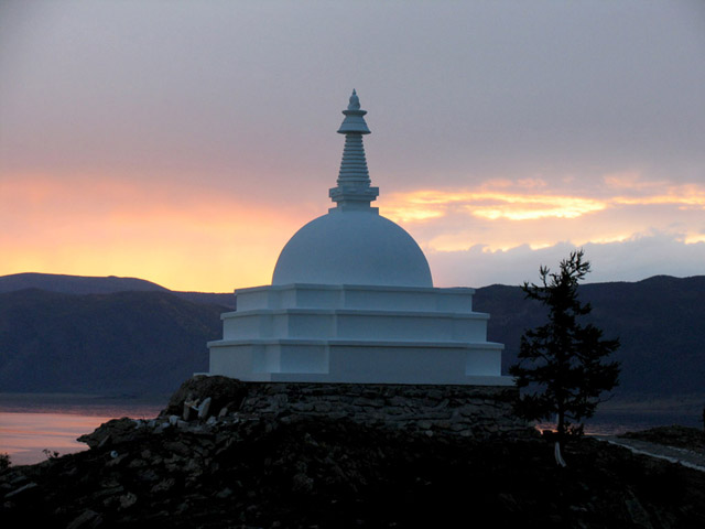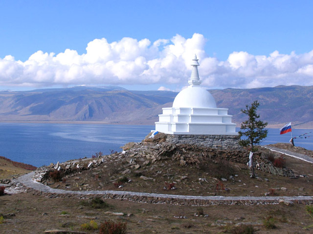 «Всеблагая Ступа Великого Блаженства», официально именуемая как Ступа Просветления, на острове Огой возведена летом 2005 г. Место для строительства ступы хотя и выбиралось спонтанно, без каких-либо определенных причин, в итоге оказалось глубоко символичным. Остров Огой, протянувшийся узкой извивающейся полоской суши с юга на север на 6 км, с воздуха сильно напоминает танцующую дакиню с распростертыми руками, отчетливо читается контур головы с плечами в северной части острова и разведенные в стороны и согнутые в локтях руки. Ступа, сооруженная на самой высокой отметке острова (512 м), на высоте 60 м над уровнем Байкала оказалась расположенной как раз в области груди, на месте сердца.Инициатива возведения ступы на Байкале исходила от московского Дхарма-центра Трома Нагмо. Ступа возведена за счет частных пожертвований.