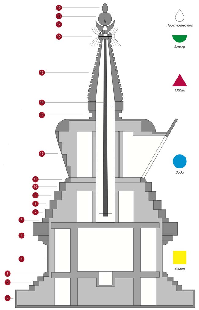 14. Древо жизни (оно внутри ступы, и его не видно). Это центральный стержень ступы. Древо символизирует «десять видов трансцендентального знания», различные аспекты мудрости Будды. На пути без Учения достигается полное Просветление.